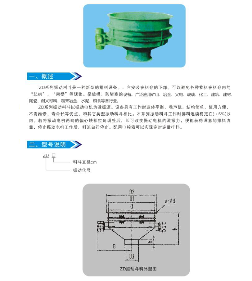 ZD系列振動(dòng)料斗是一種新型的排料設(shè)備。,它安裝在料倉(cāng)的下部。可以避免各種物料在料倉(cāng)內(nèi)的“起拱”、“架橋”等現(xiàn)象。是破拱、防堵塞的有效設(shè)備。廣泛應(yīng)用礦山、冶金、火電、玻璃、化工、建筑、建材、陶瓷、耐火材料、粉末冶金、水泥、糧食等各行業(yè)。